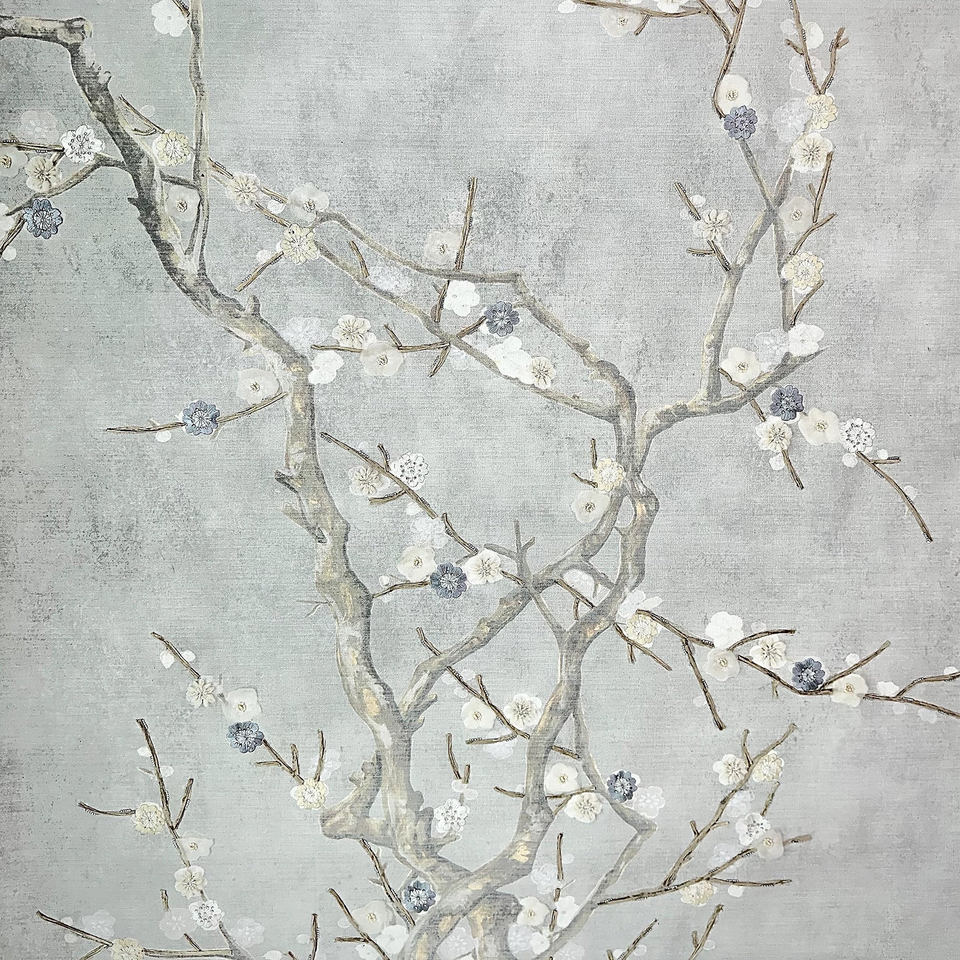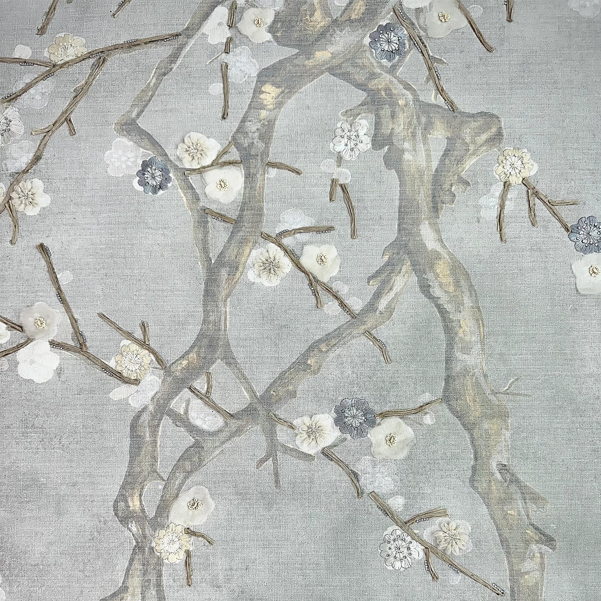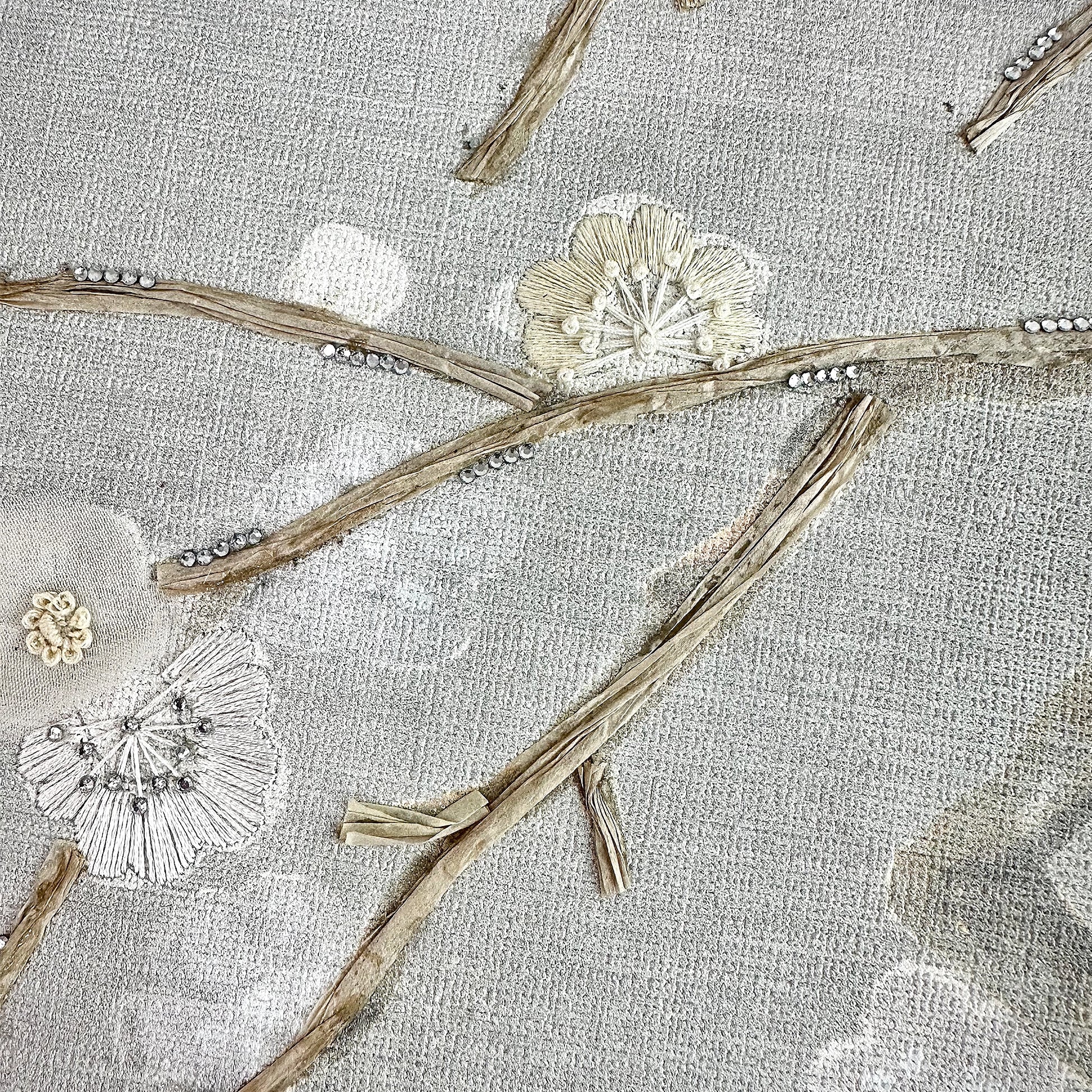 A celebration of mixed-media artistry, AKARI is a symphony of texture and light crafted on a premium Canvas base. This intricate design pushes the boundaries of the Multi-Work technique, layering delicate Organza fabric and Silk threads with unique Straw-effect Crape Paper for an organic, 3D finish. Punctuated with shimmering Cutdana and the brilliant sparkle of Swarovski stones, it transforms nature-inspired motifs into a luxurious, jewel-like wallcovering.