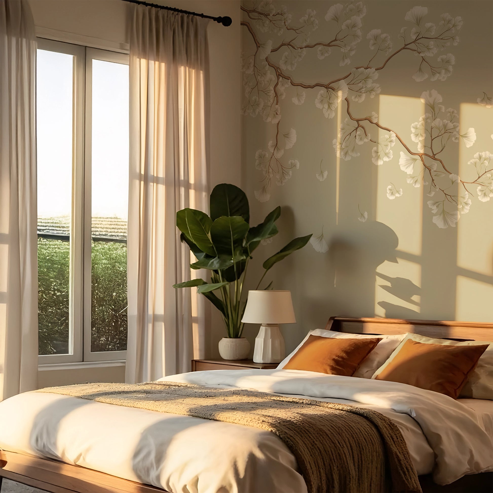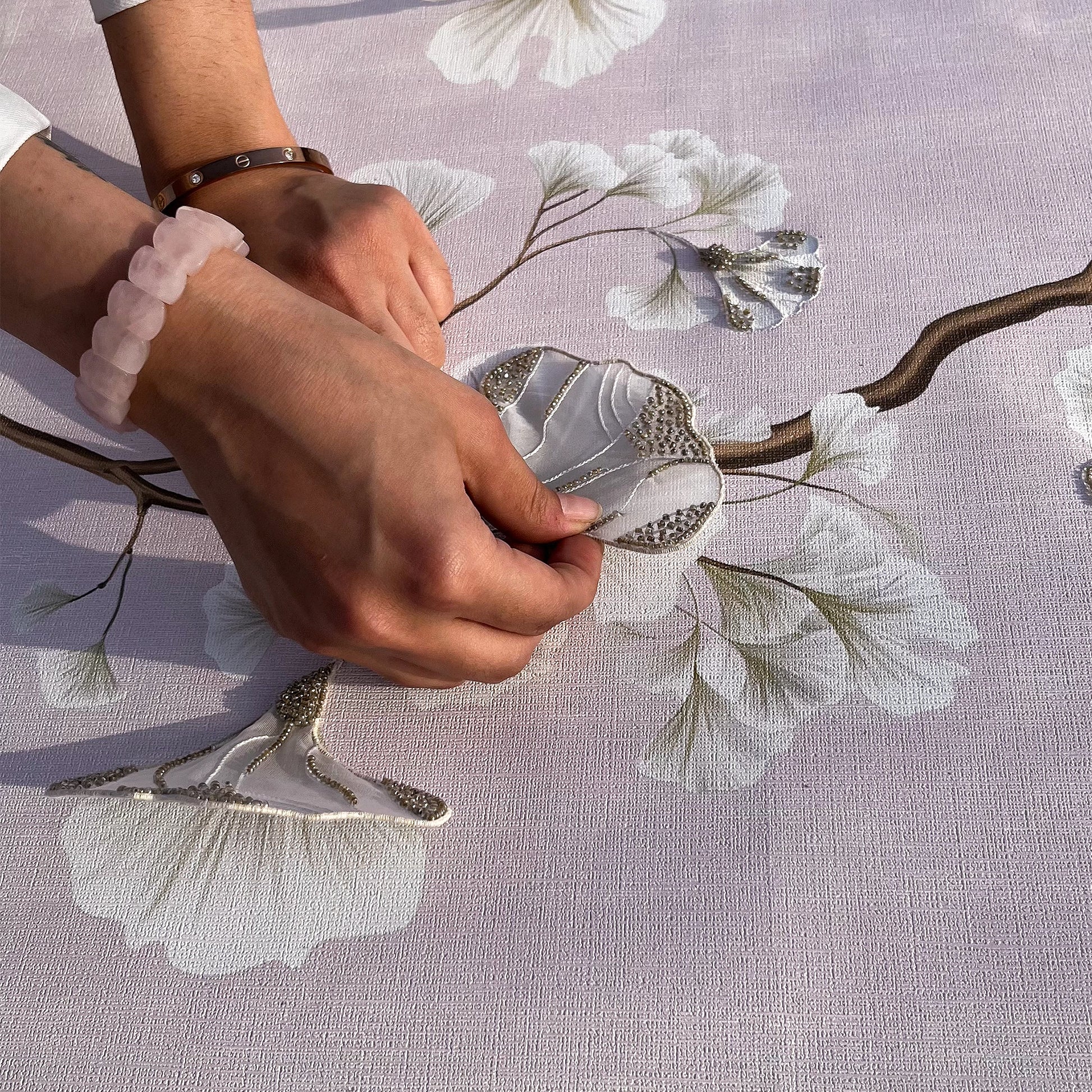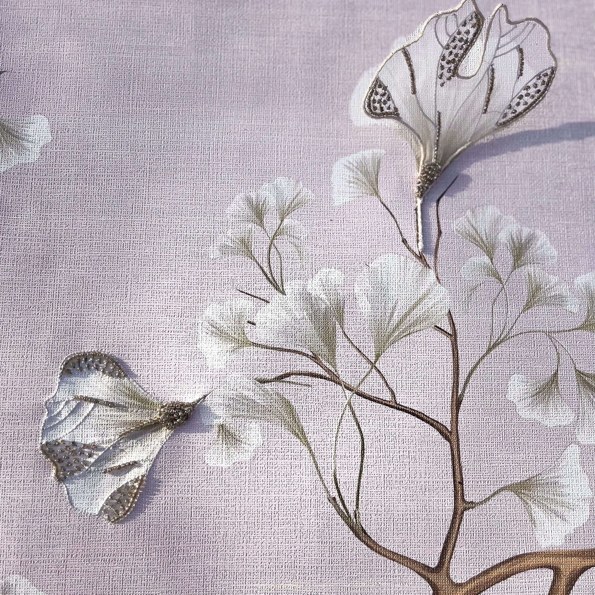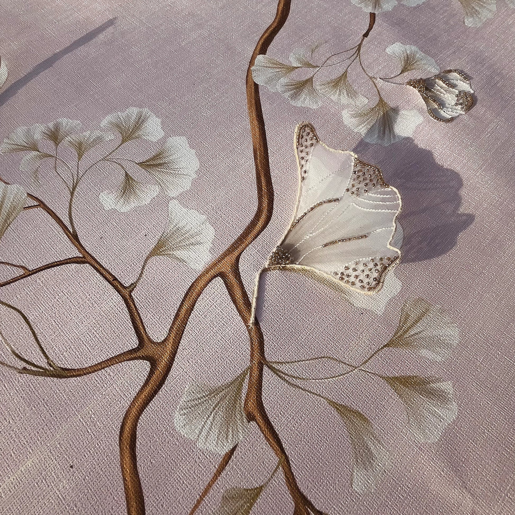 Capturing the warm, fleeting essence of the season, AUTUMN SILK is a masterclass in textile layering. This piece features delicate Appliqué work using ethereal Organza fabric to create soft, dimensional petals and leaves. Stitched with fine Silk threads and accented with shimmering Glass beads, the design is set upon a luxurious Slub Silk base. The natural texture of the silk foundation enhances the handcrafted feel, bringing a rich, organic warmth and high-fashion elegance to your interior.