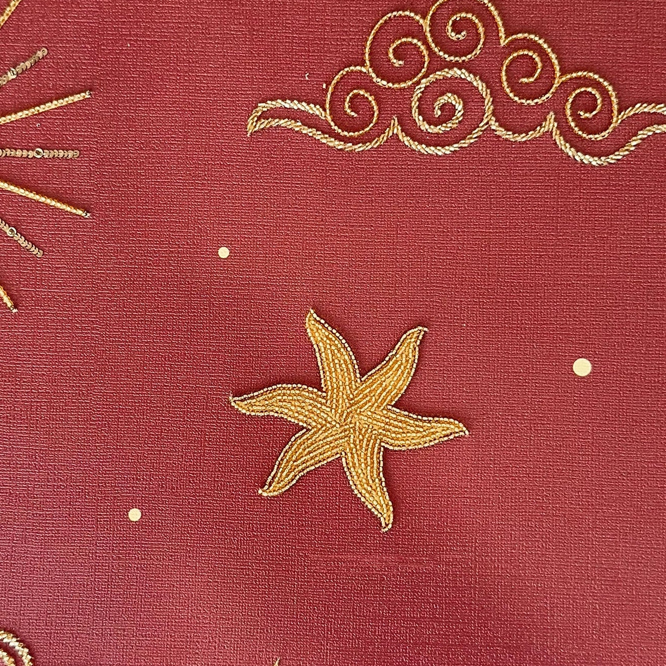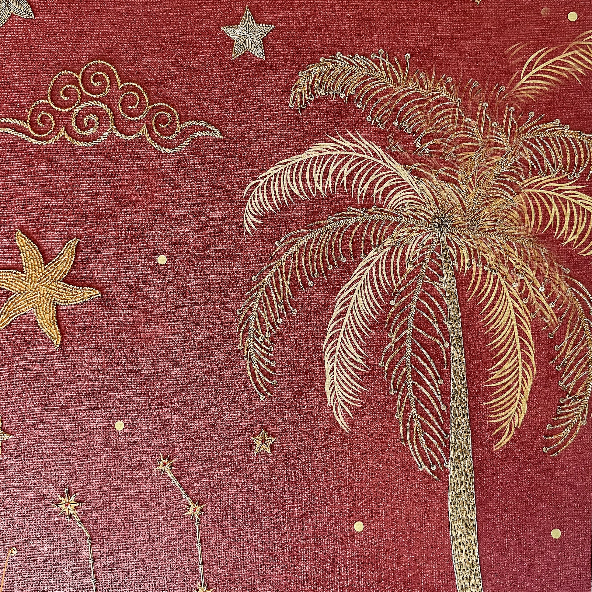 A celestial masterpiece of light and structure, CELESTINE transforms abstract art into a high-texture sensory experience. Crafted on a premium Canvas base, this design utilizes a sophisticated Multi-Work technique to create a shimmering, cosmic landscape. The composition is defined by the architectural depth of Kasab Dori and the reflective brilliance of Mukesh strips. Intricate layers of Nalki and Cutdana are meticulously hand-stitched alongside sparkling Sequins, resulting in a multidimensional surface that captures and diffuses light with ethereal elegance.
