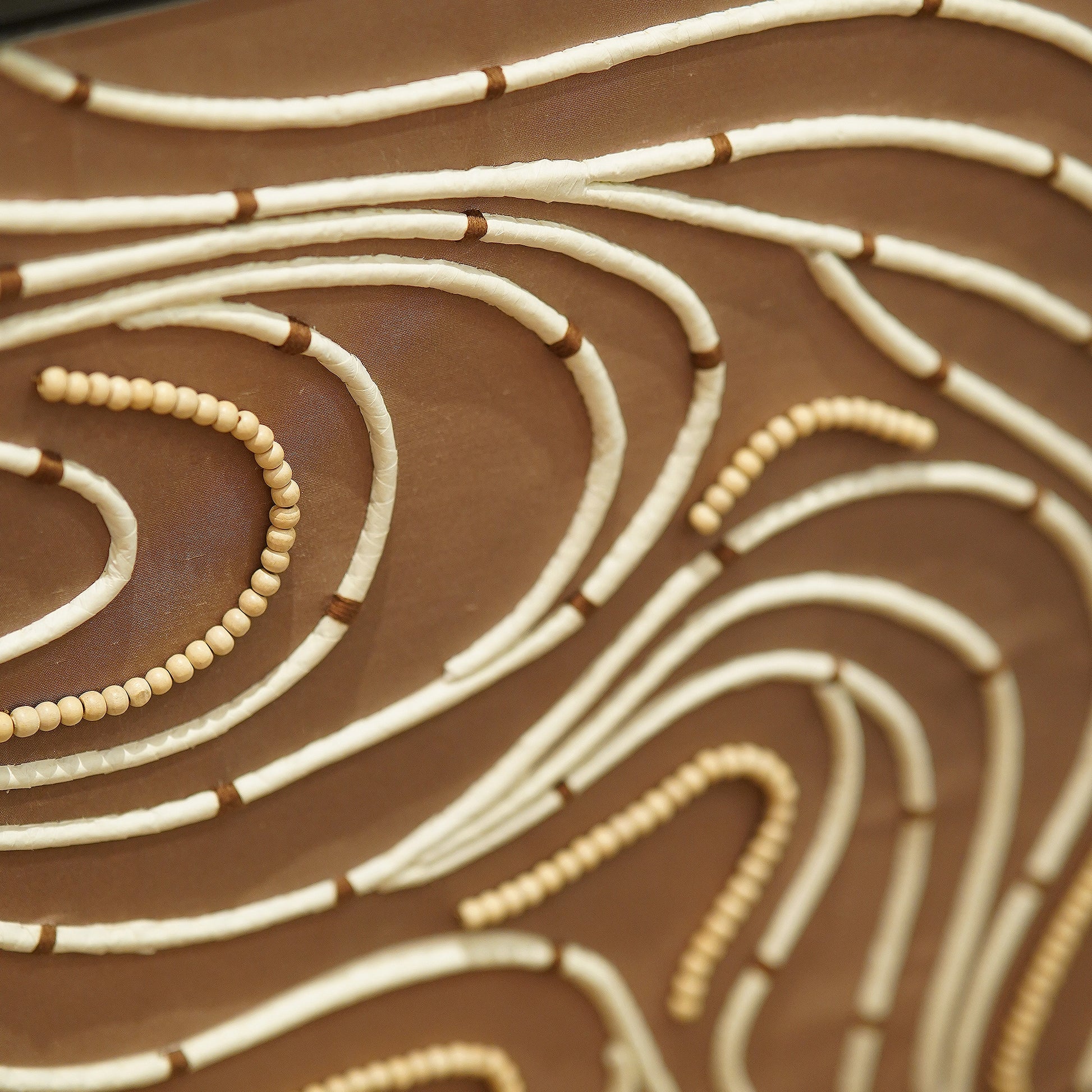 A rhythmic exploration of texture, CRÊPE FLOW LINES is set on a luxurious Slub Silk base. This design features an innovative mix of materials, utilizing crape paper to create organic, flowing forms. These sculptural lines are secured with precision Anchor thread stitching and accented by hand-placed wooden beads. The result is a sophisticated, earth-toned relief that balances modern abstract geometry with a natural, tactile warmth.