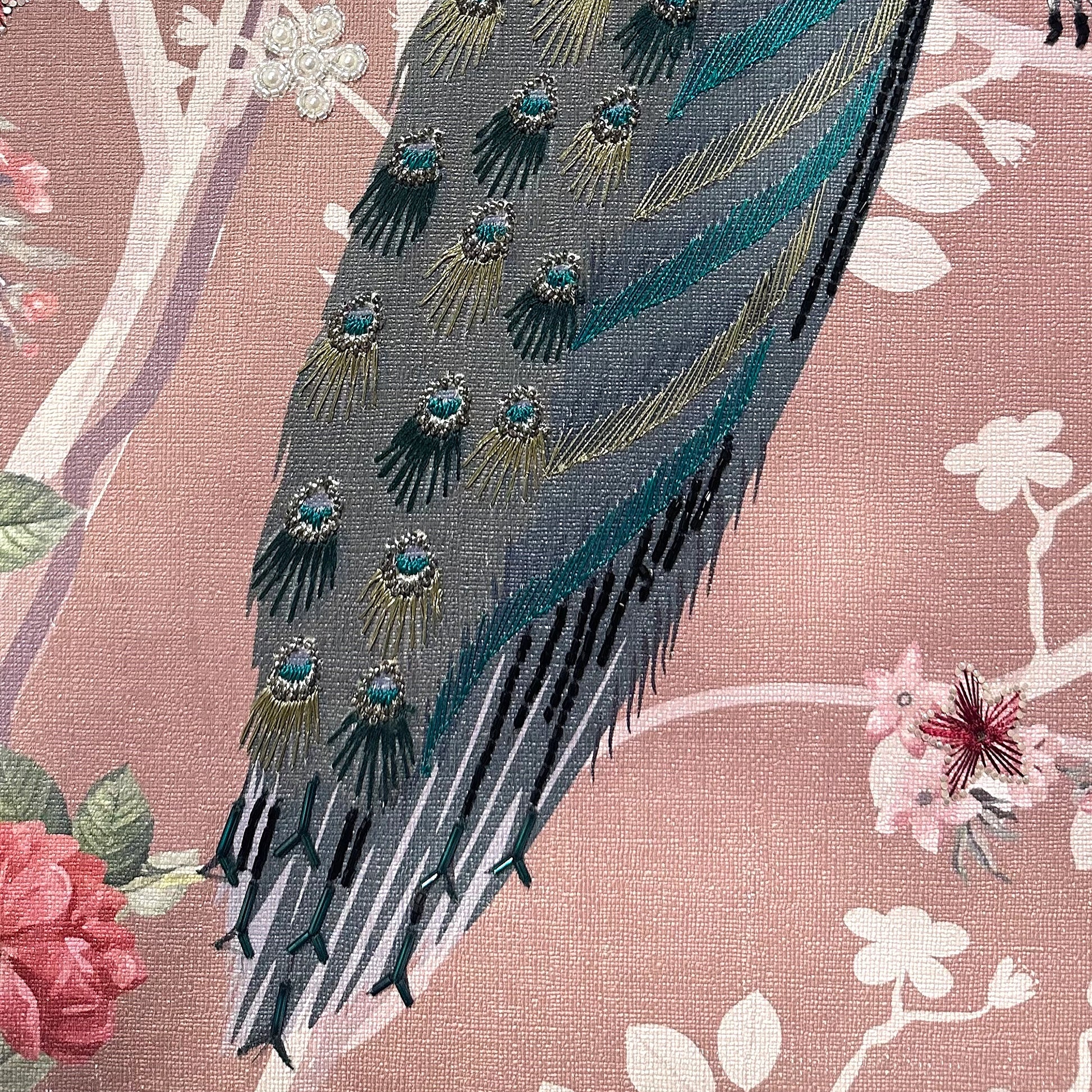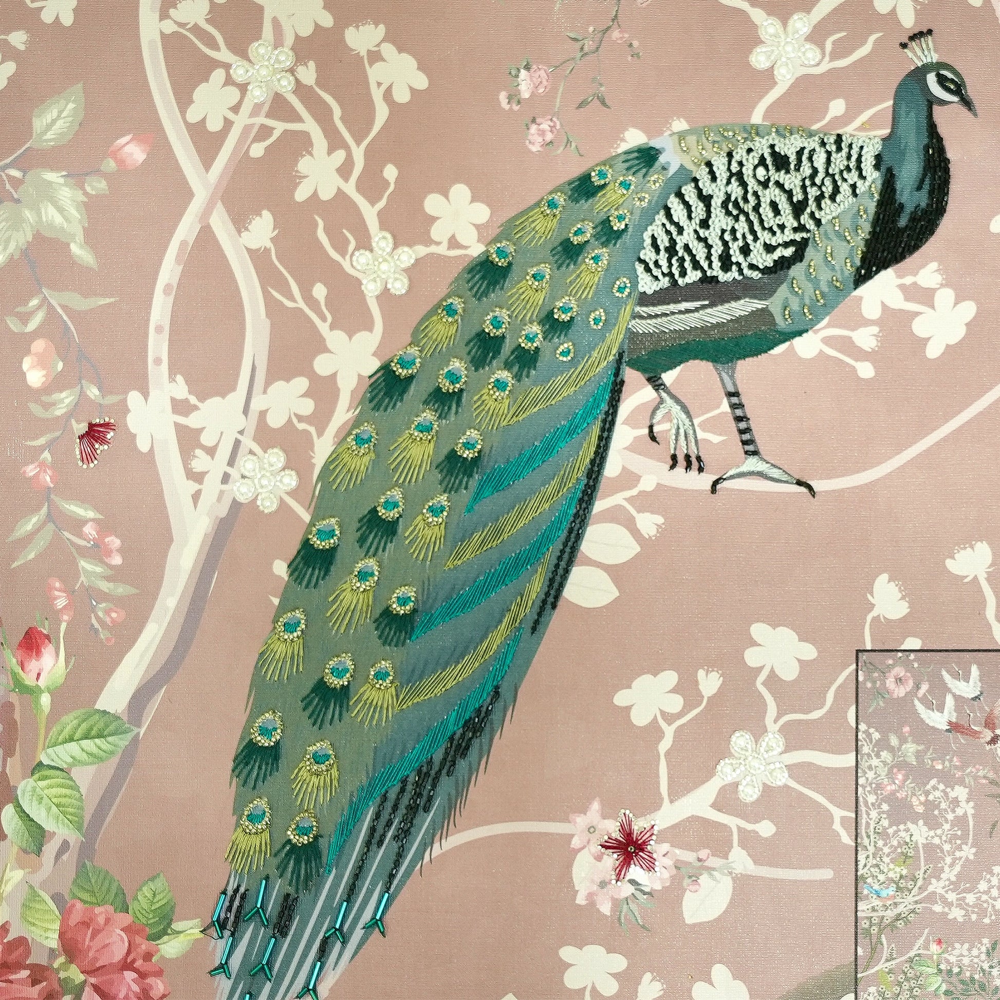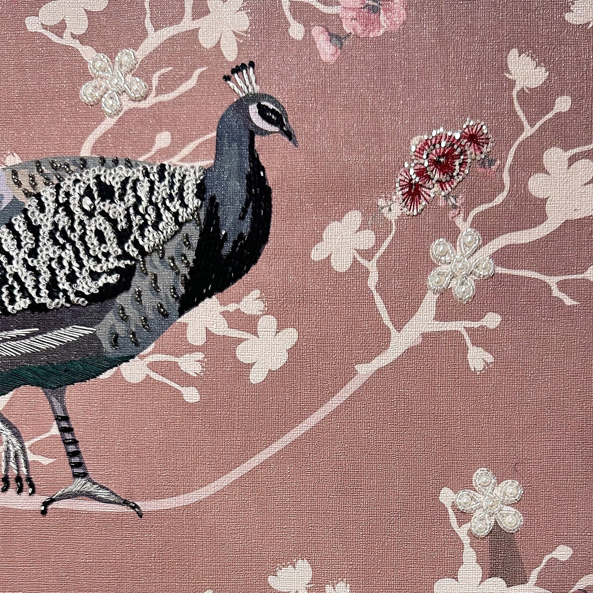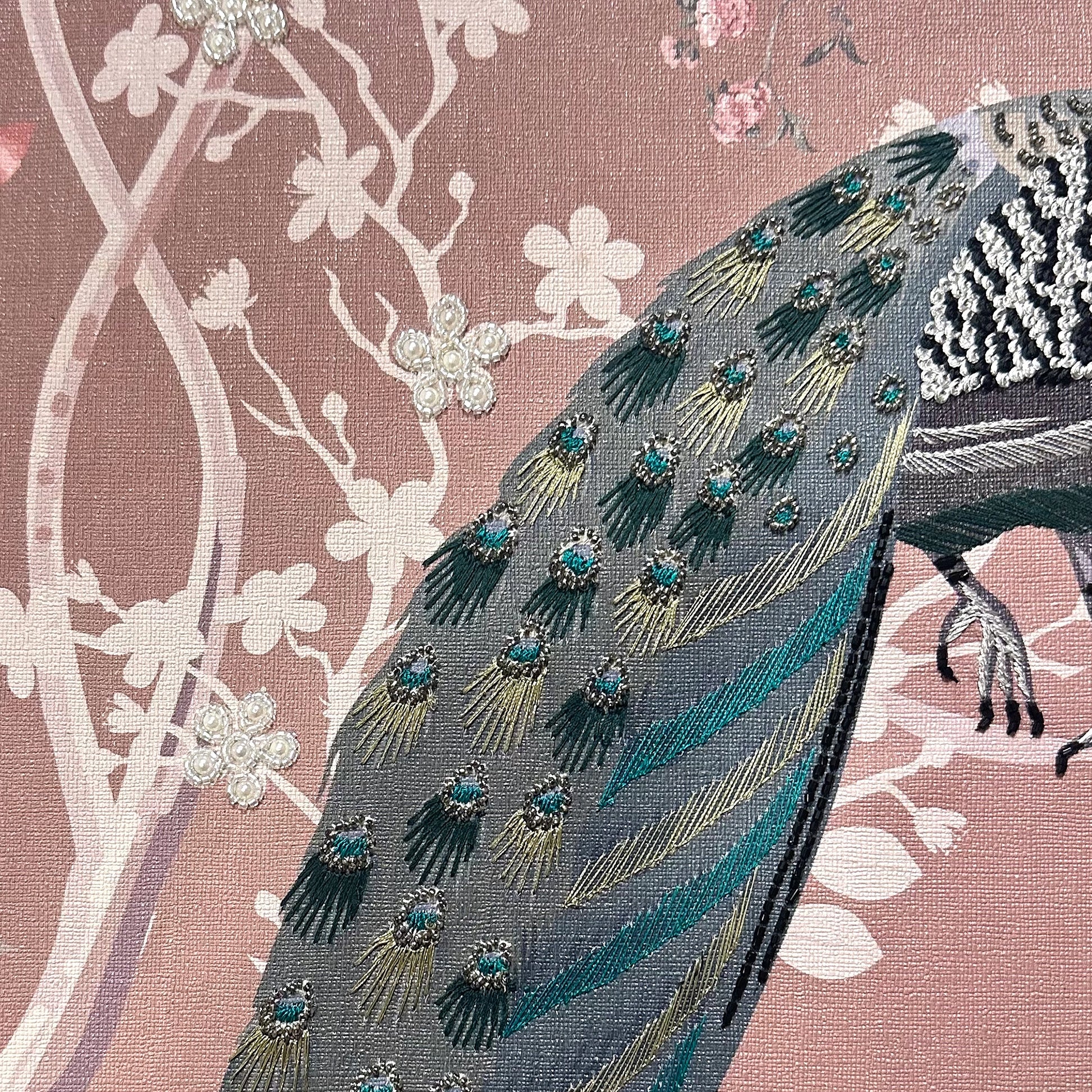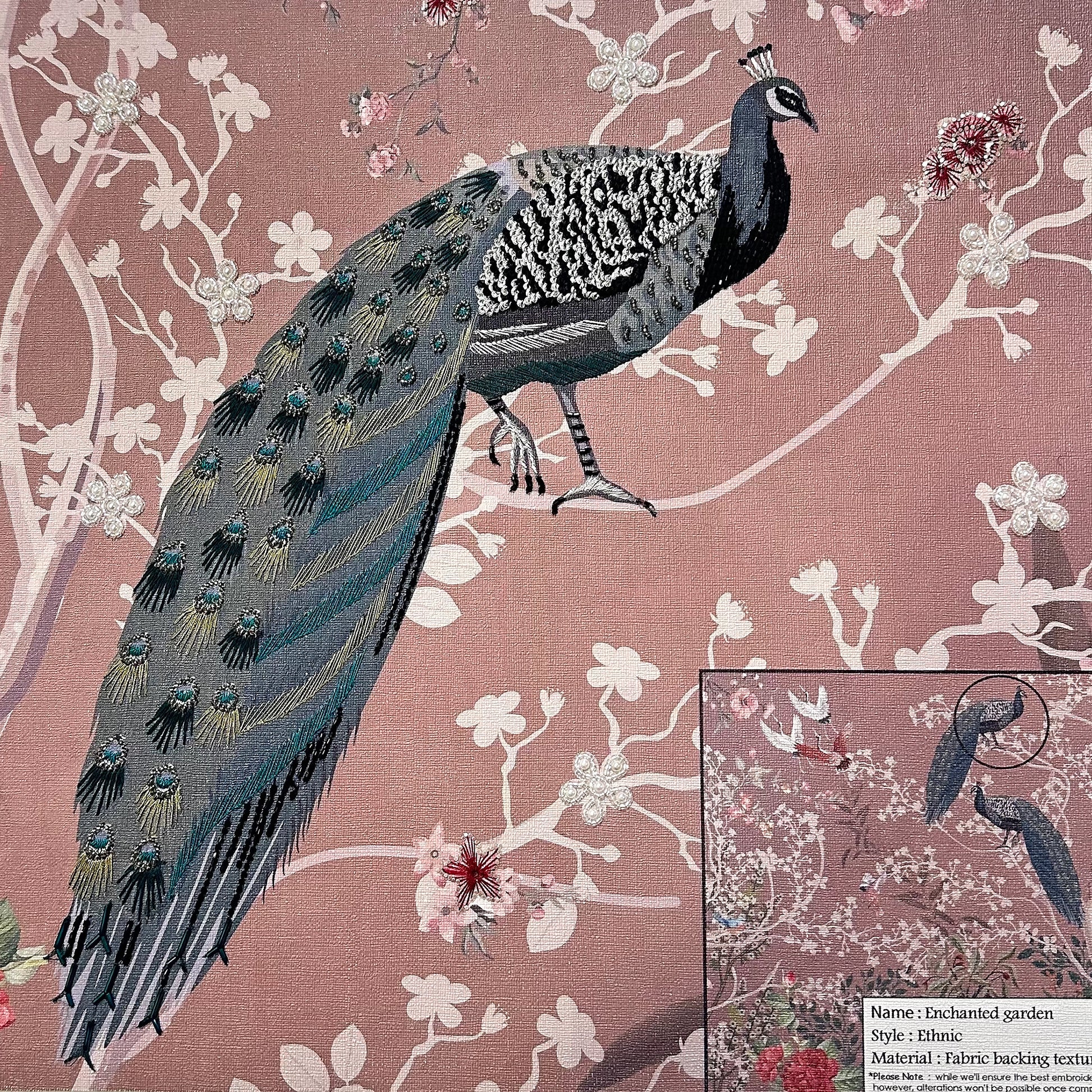 A lush, botanical wonderland brought to life with exquisite detail, ENCHANTED GARDEN is a centerpiece of artisanal storytelling. Set on a durable Fabric Backing, this design employs a sophisticated Multi-Work technique to create a rich, layered landscape. Delicate Silk Thread embroidery provides a soft, organic foundation, while shimmering Cutdana and Rhinestones add a brilliant, jewel-like dimension. Hand-applied Half-Cut Pearls offer a classic touch of elegance, all finished with a dusting of Glitter to capture the ethereal glow of a hidden paradise.