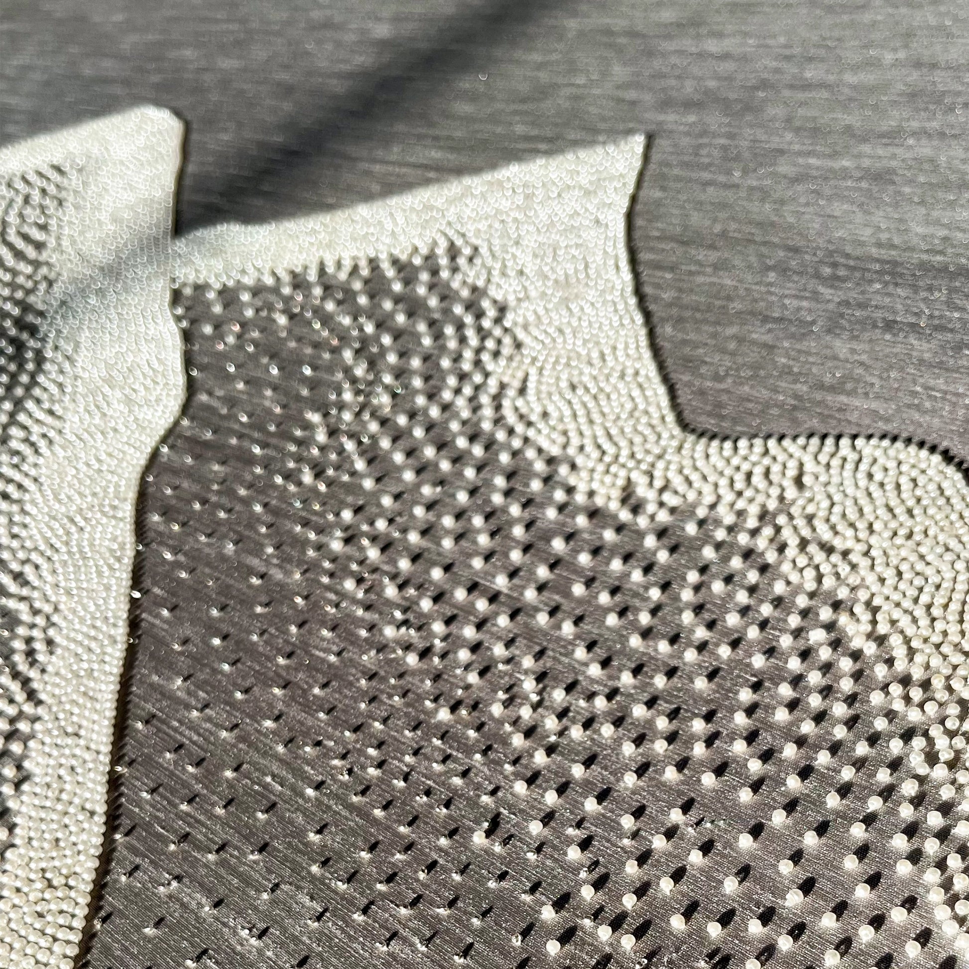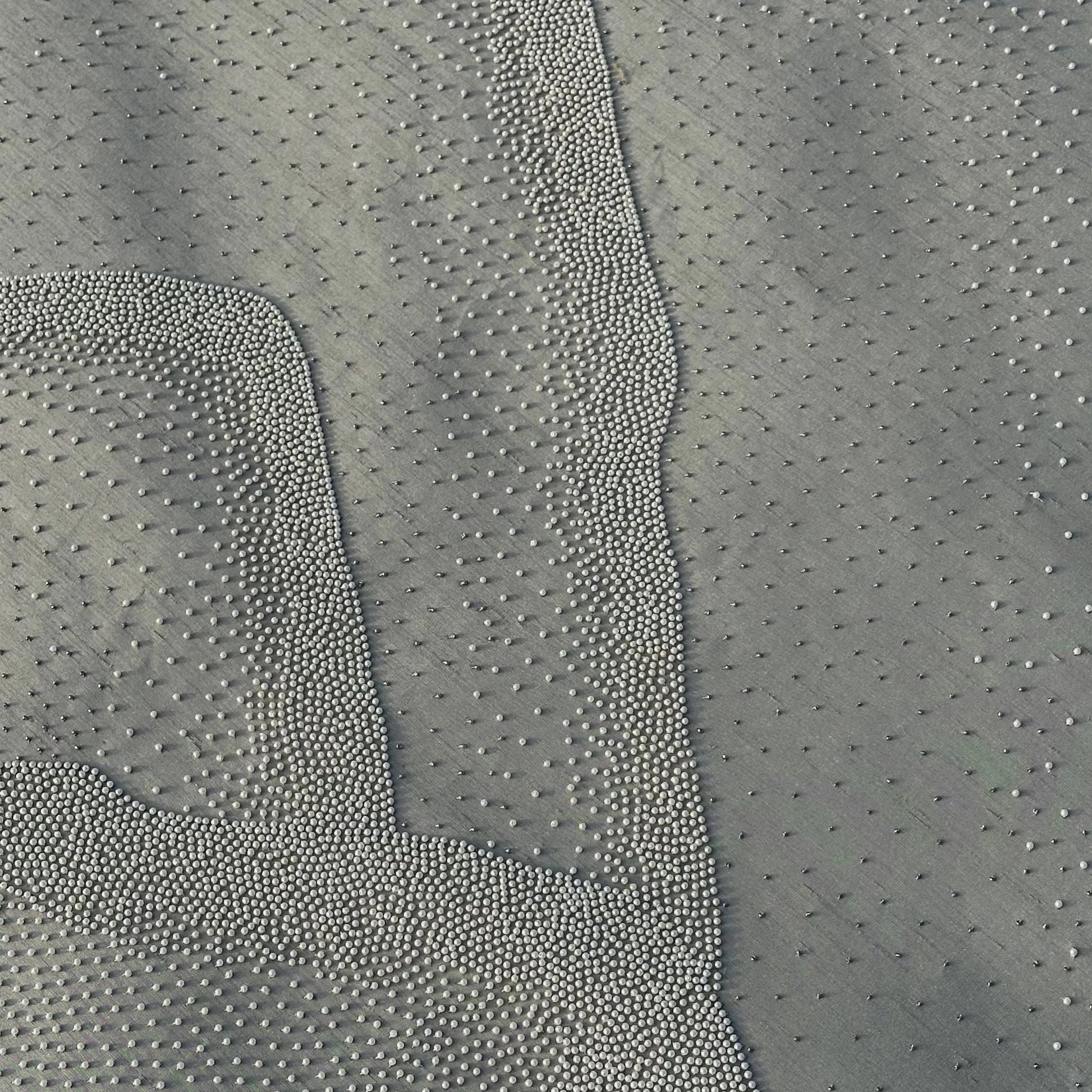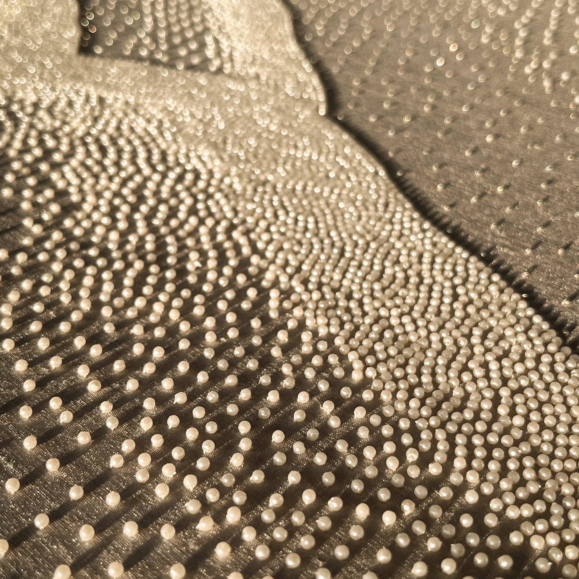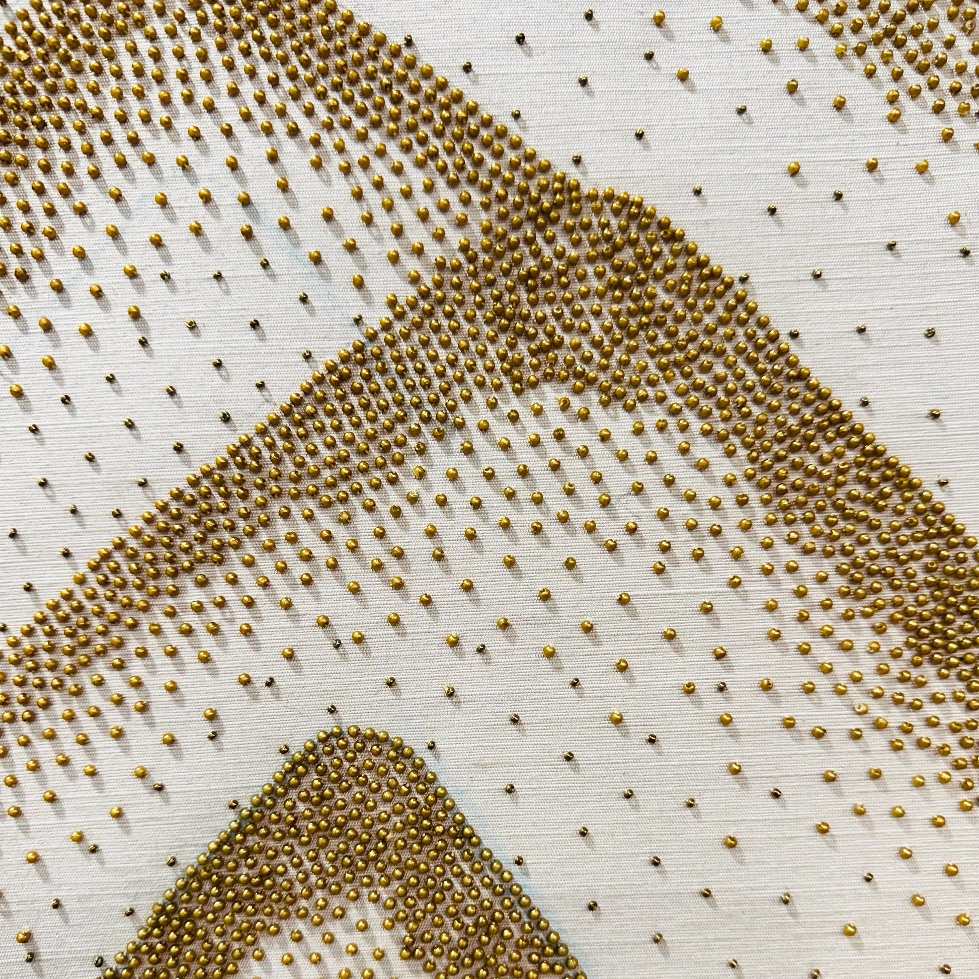 Through the delicate use of hand-stitched pearls, this abstract work offers a rich, 3D texture that transforms light and space into a tactile art experience.