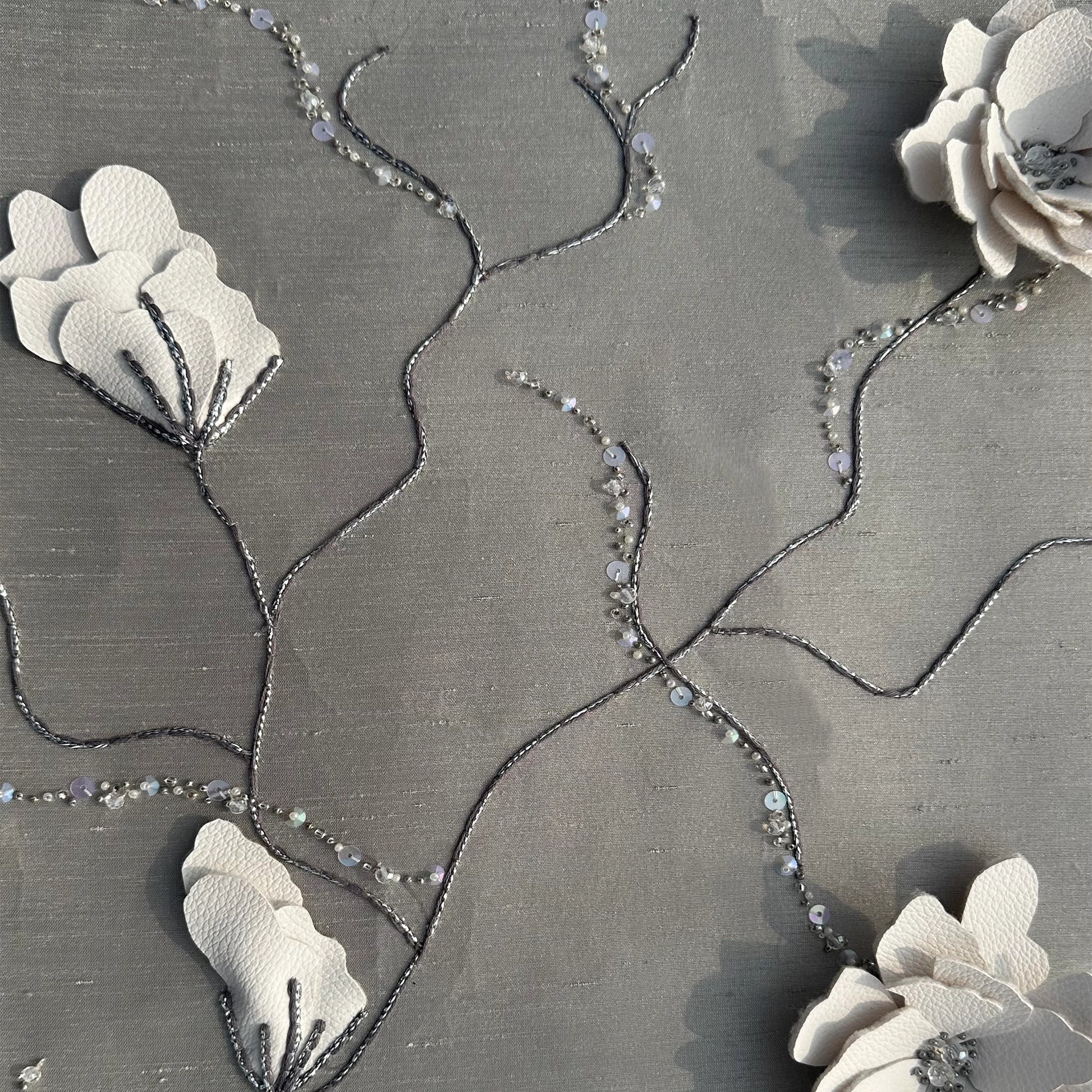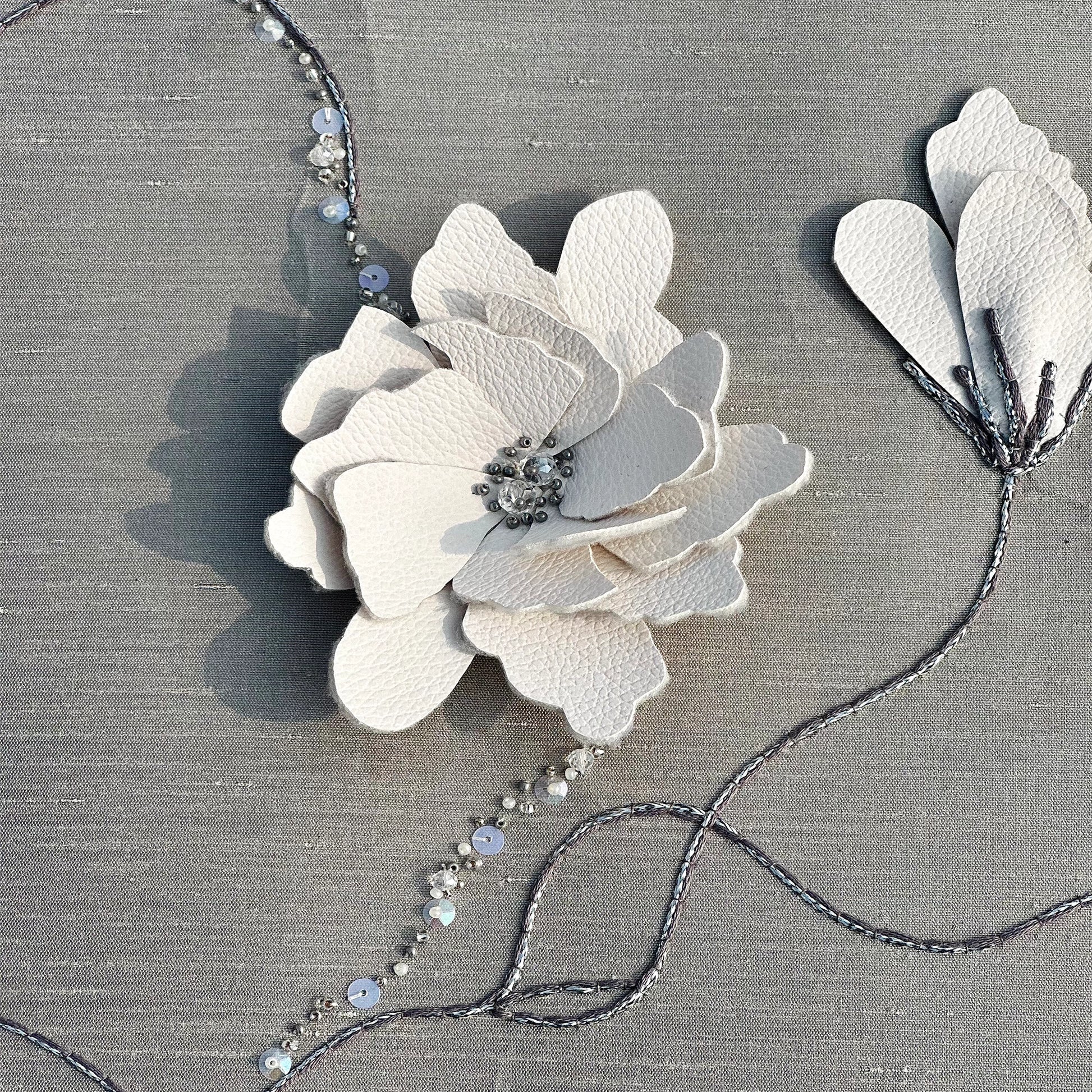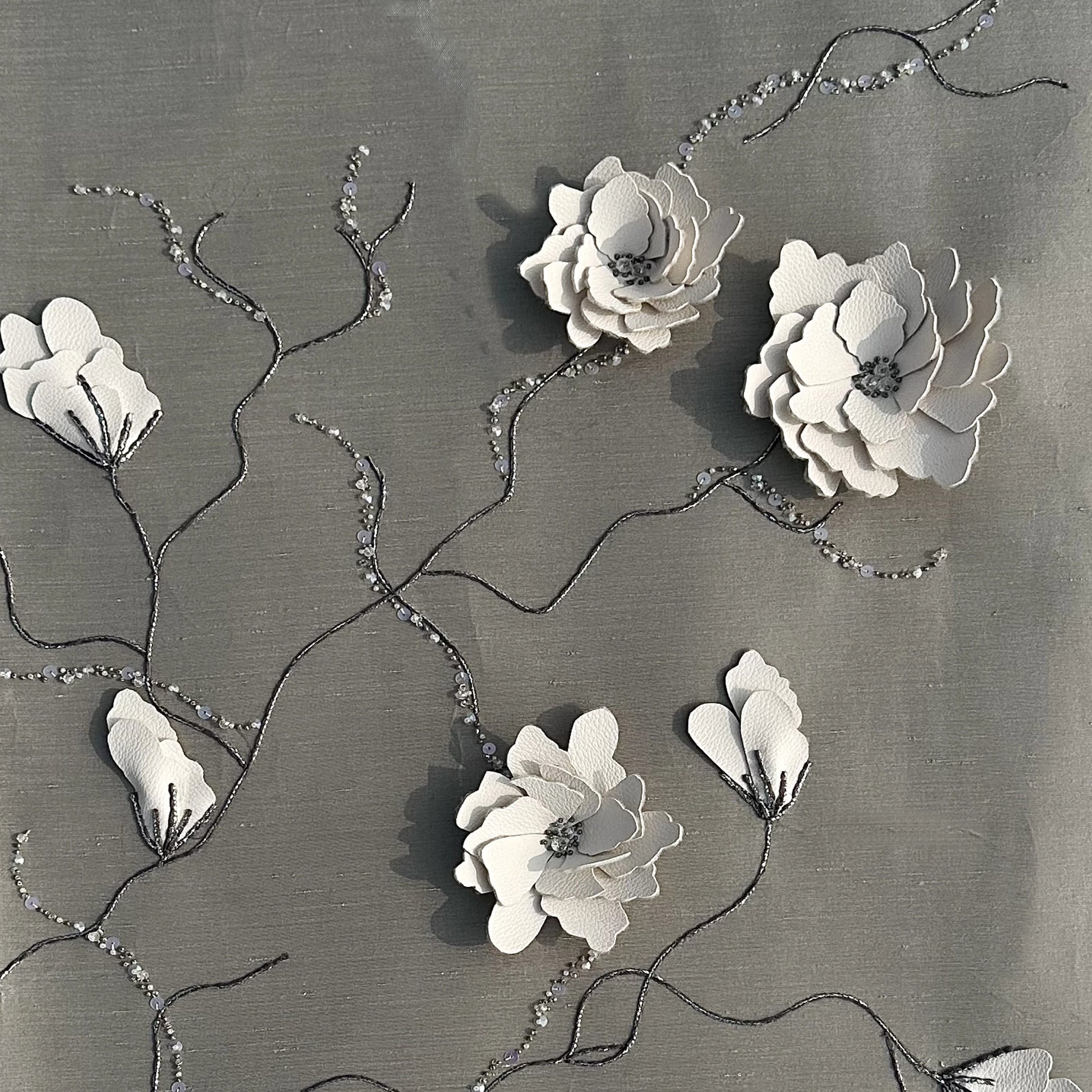 A masterpiece of multi-dimensional craftsmanship, RELIEVO is an opulent celebration of texture set against a luxurious Slub Silk base. This design pushes the boundaries of the Leather Accents technique, featuring sculpted leather forms that provide a bold, architectural relief. The composition is intricately detailed with a rich variety of embellishments, including new cut moti, shimmering sequins, and structured button dori. Accented with glass beads, antique silver beads, and precision Anchor thread work, this piece offers a sophisticated interplay of metallic sheen and organic leather, creating a high-fashion botanical statement.