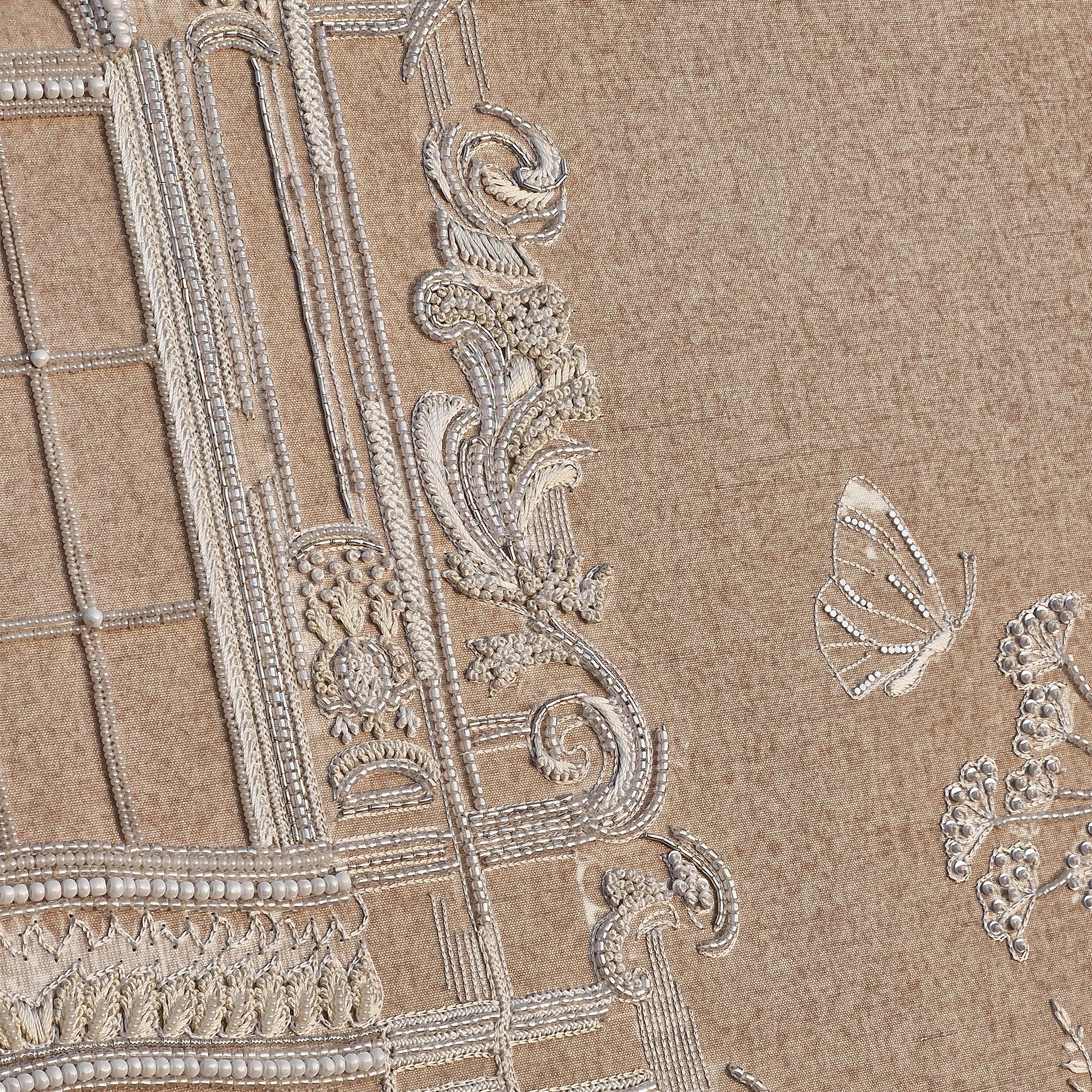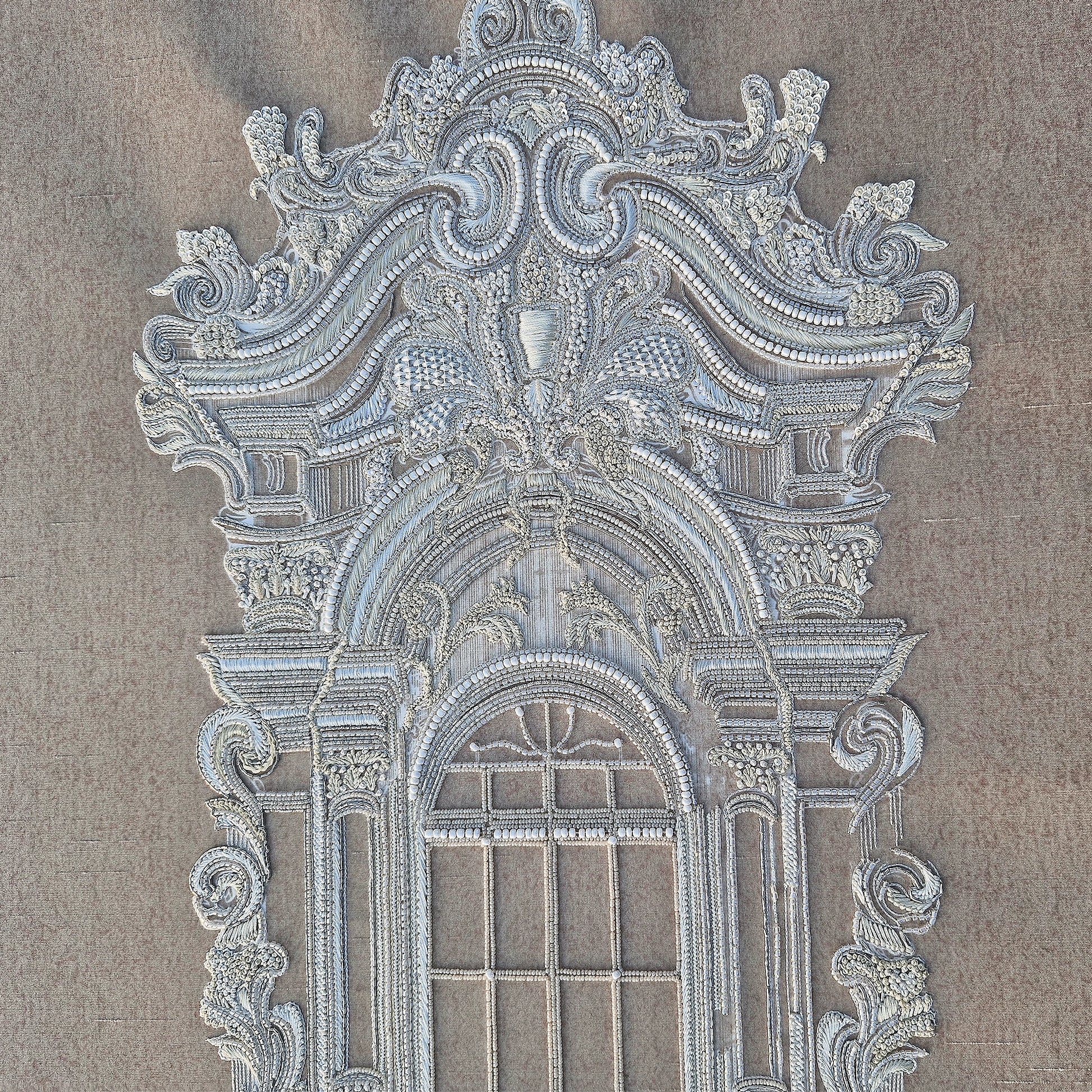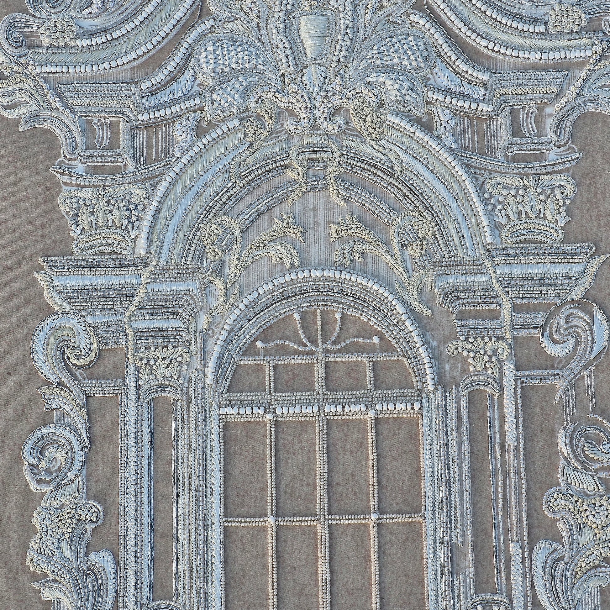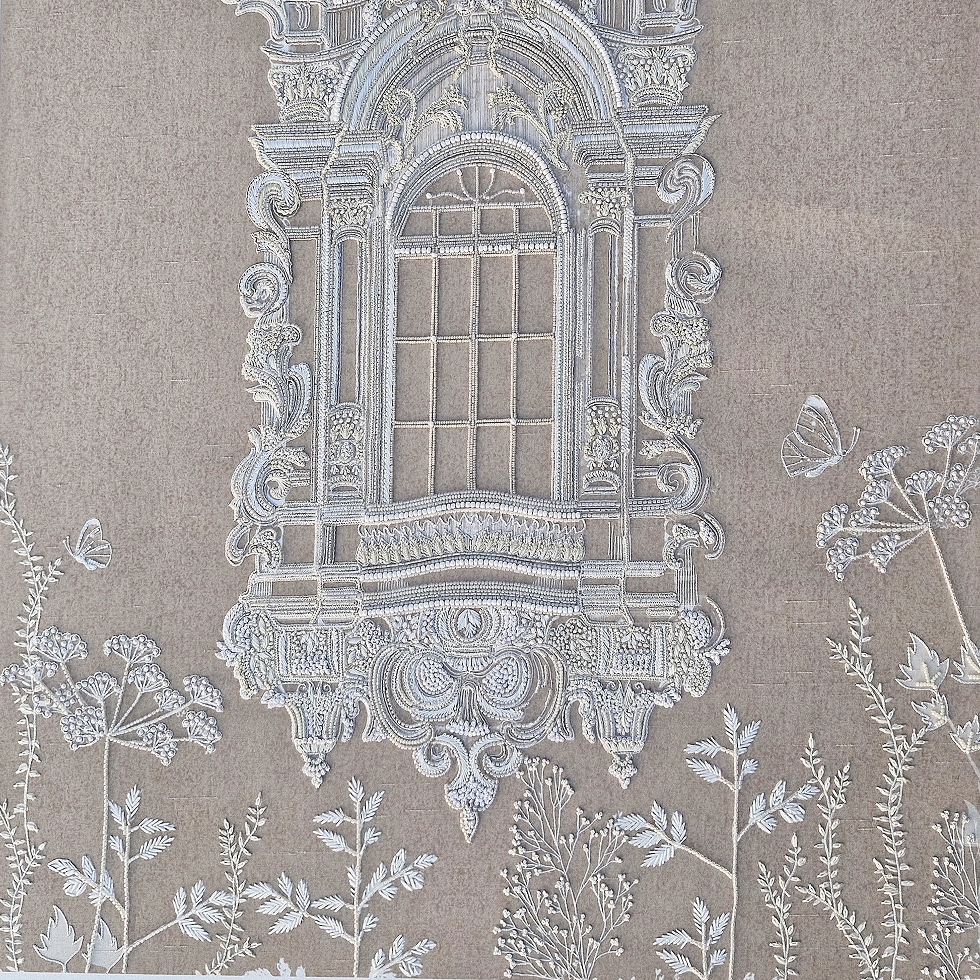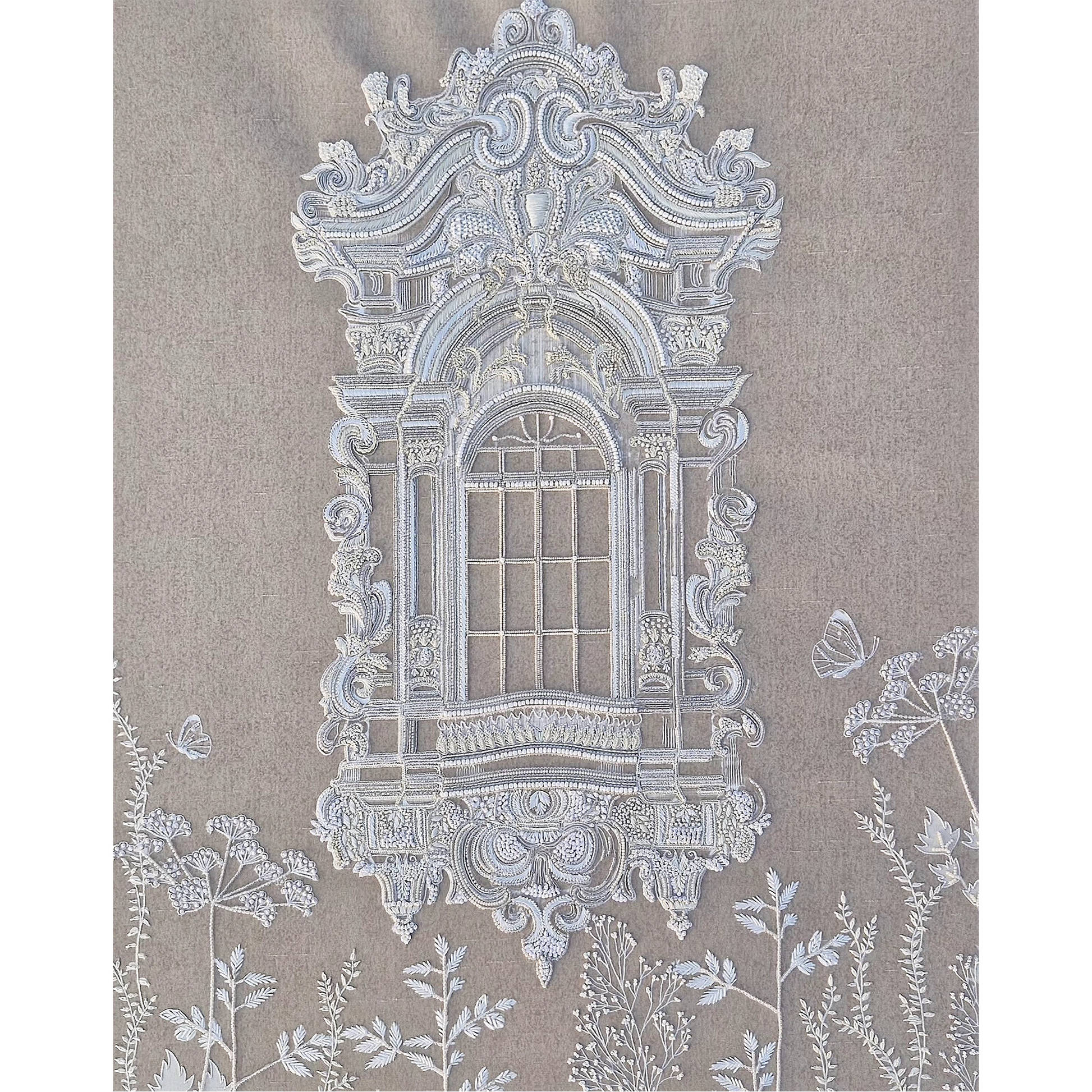 Ruiner la vitre is an architectural botanical composition set on a Slub Silk base, featuring an ornate window frame surrounded by delicate floral motifs and butterflies. Utilizing The Thread Gallery technique, the design uses white silk thread to create intricate, high-relief embroidery. The structured "window" is embellished with dabka and cutdana for metallic definition, while hand-placed moti and sequins add a shimmering, light-catching texture across the greenery. This piece merges classical architectural elegance with soft natural elements through multidimensional artisanal needlework.