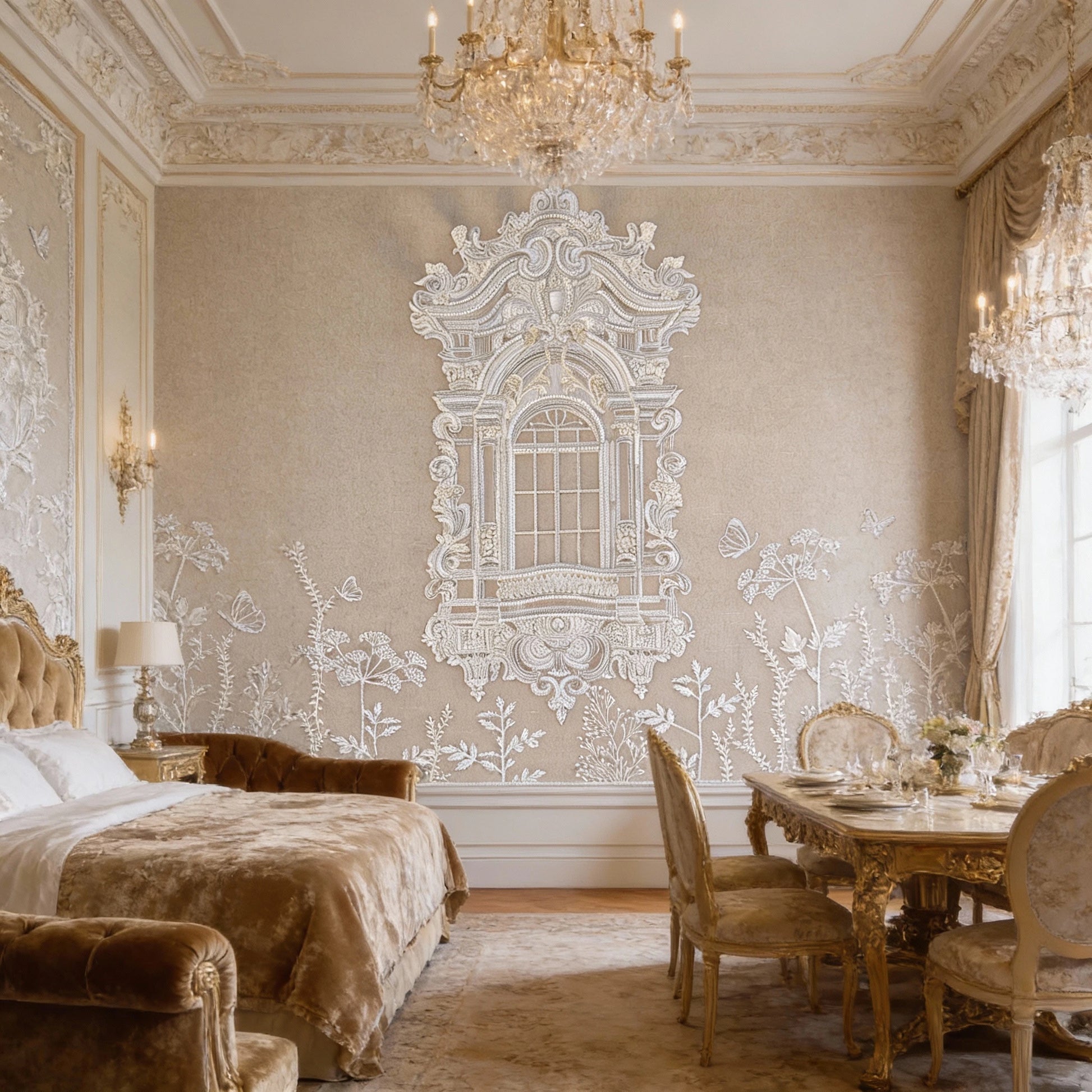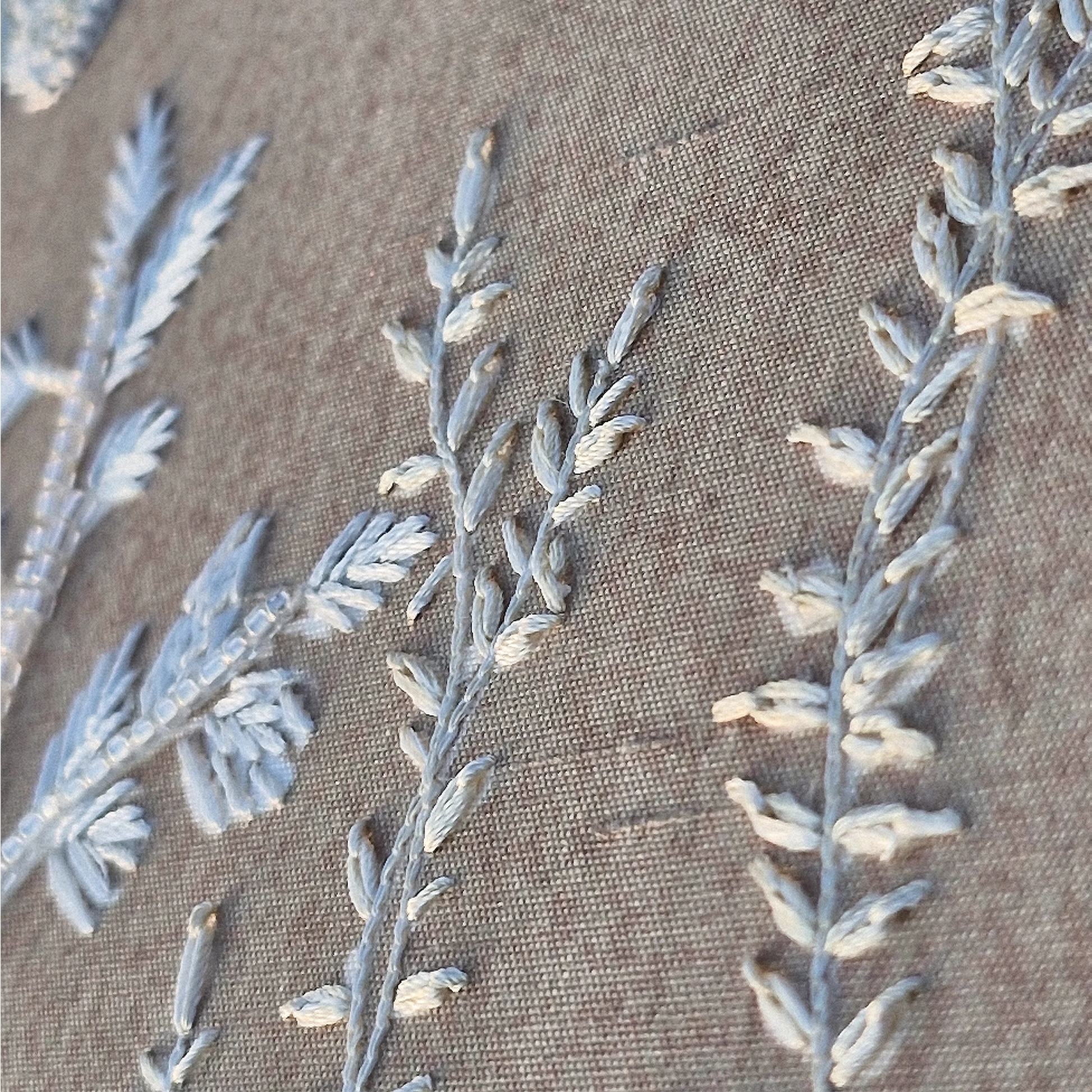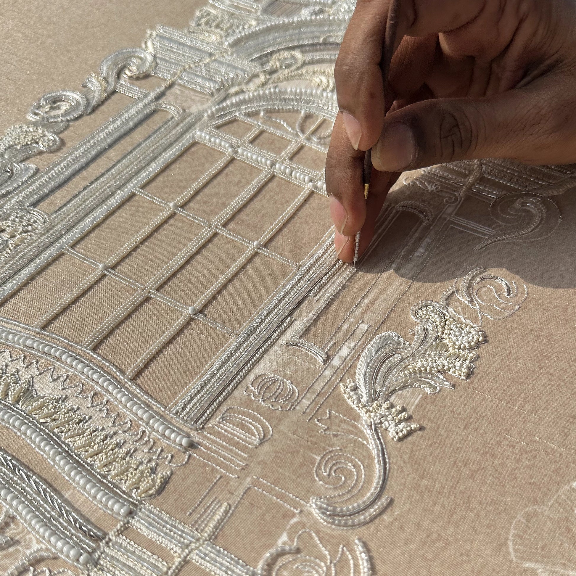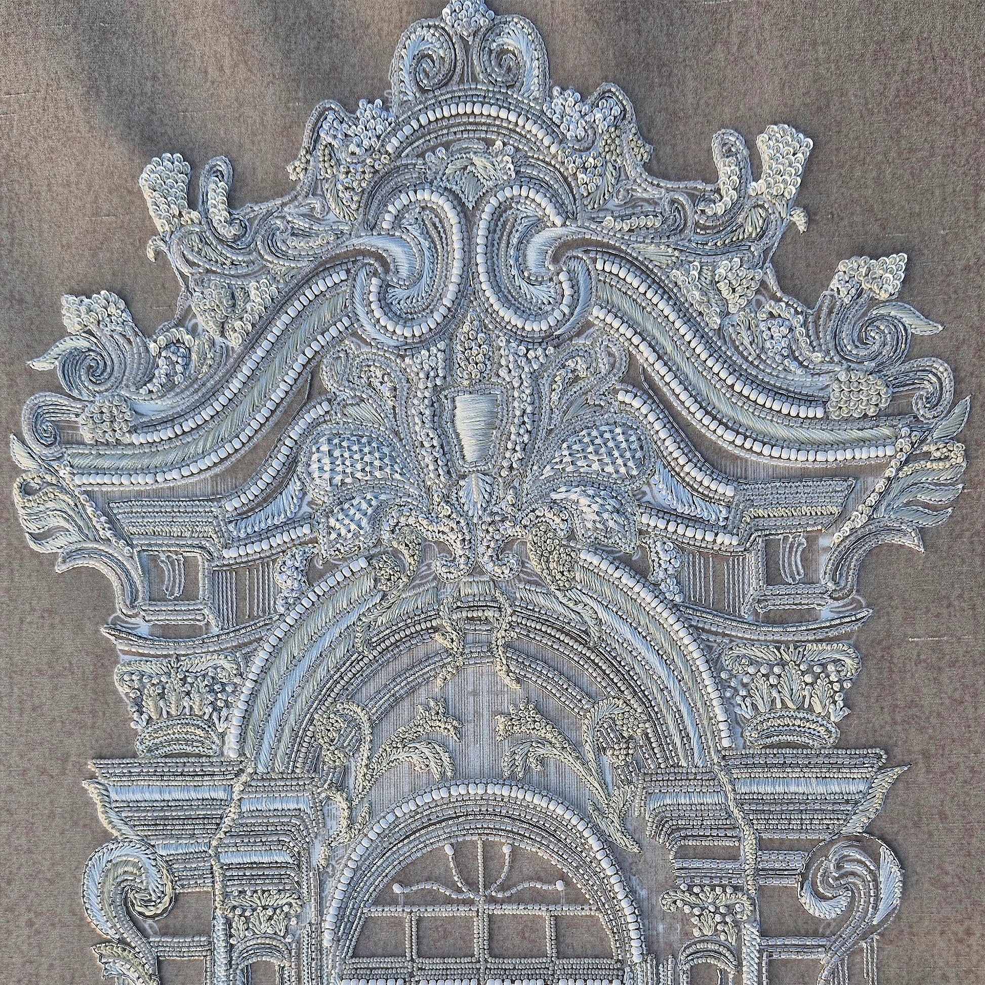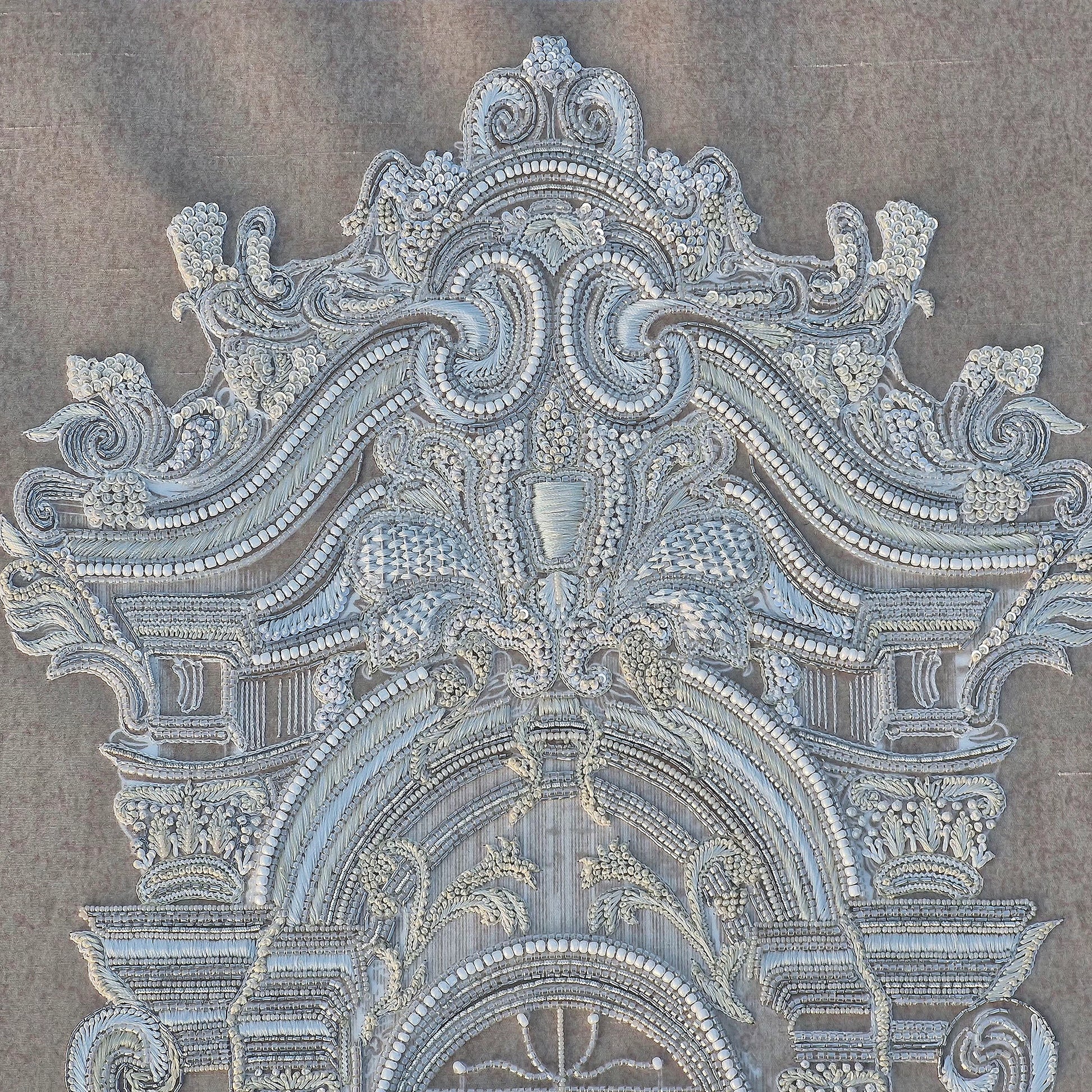 Ruiner la vitre is an architectural botanical composition set on a Slub Silk base, featuring an ornate window frame surrounded by delicate floral motifs and butterflies. Utilizing The Thread Gallery technique, the design uses white silk thread to create intricate, high-relief embroidery. The structured "window" is embellished with dabka and cutdana for metallic definition, while hand-placed moti and sequins add a shimmering, light-catching texture across the greenery. This piece merges classical architectural elegance with soft natural elements through multidimensional artisanal needlework.
