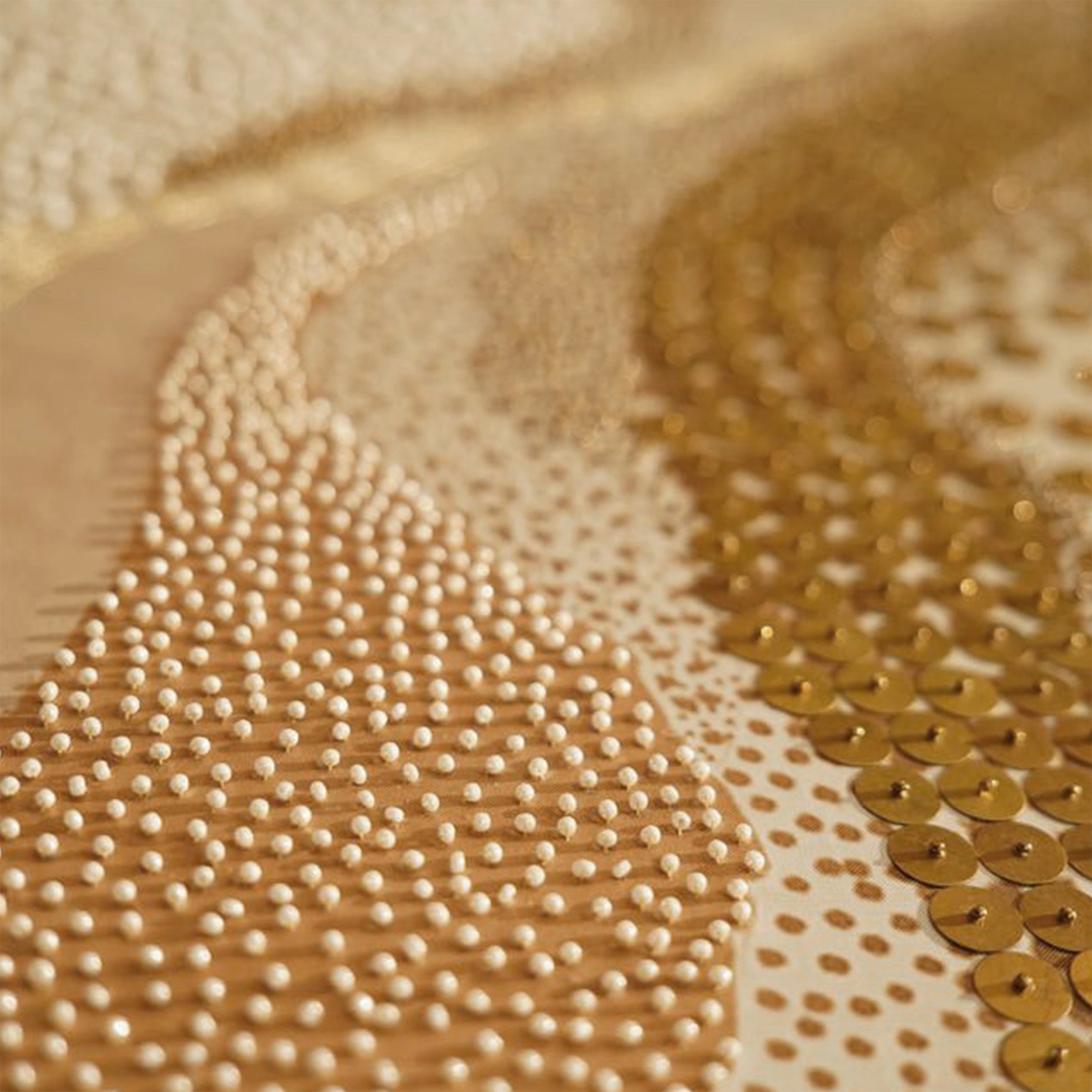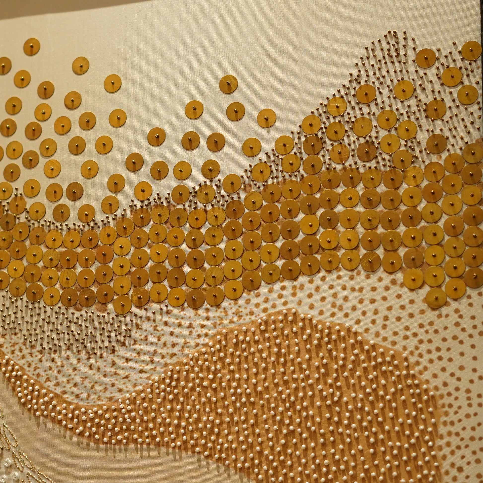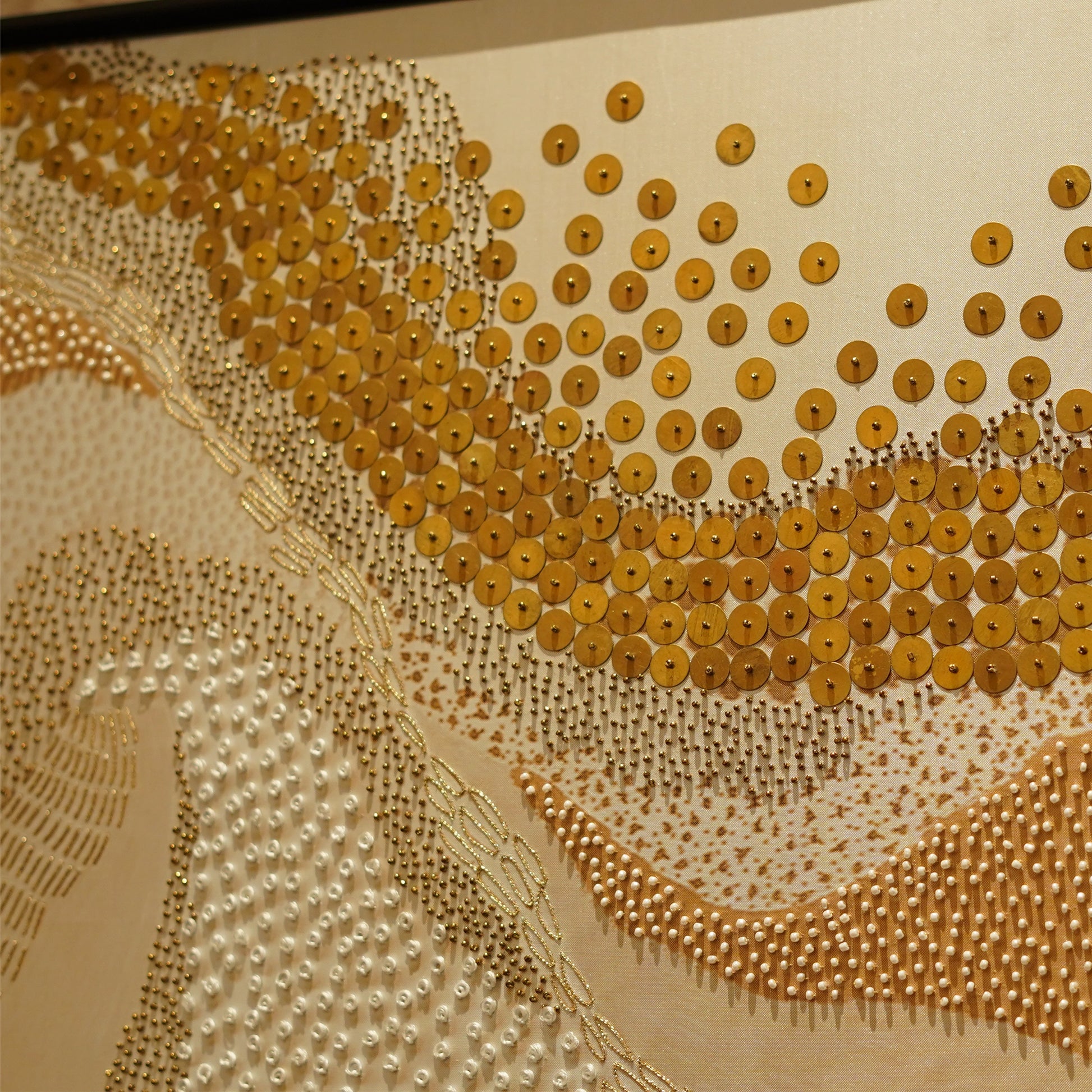 A radiant fusion of traditional craftsmanship and contemporary abstraction, SOLSTICE GLAZE captures the essence of shifting light on a luxurious Slub Silk base. This design utilizes a sophisticated Multi-Work technique, layering rich Silk Threads with the intricate textures of Zardosi Dori. The composition is brilliantly illuminated by a mix of Brass Sequins, Antique Beads, and White Glass Beads, creating a shimmering, high-relief surface. This handcrafted masterpiece offers a warm, luminous energy, transforming your walls into a gallery of tactile elegance.
