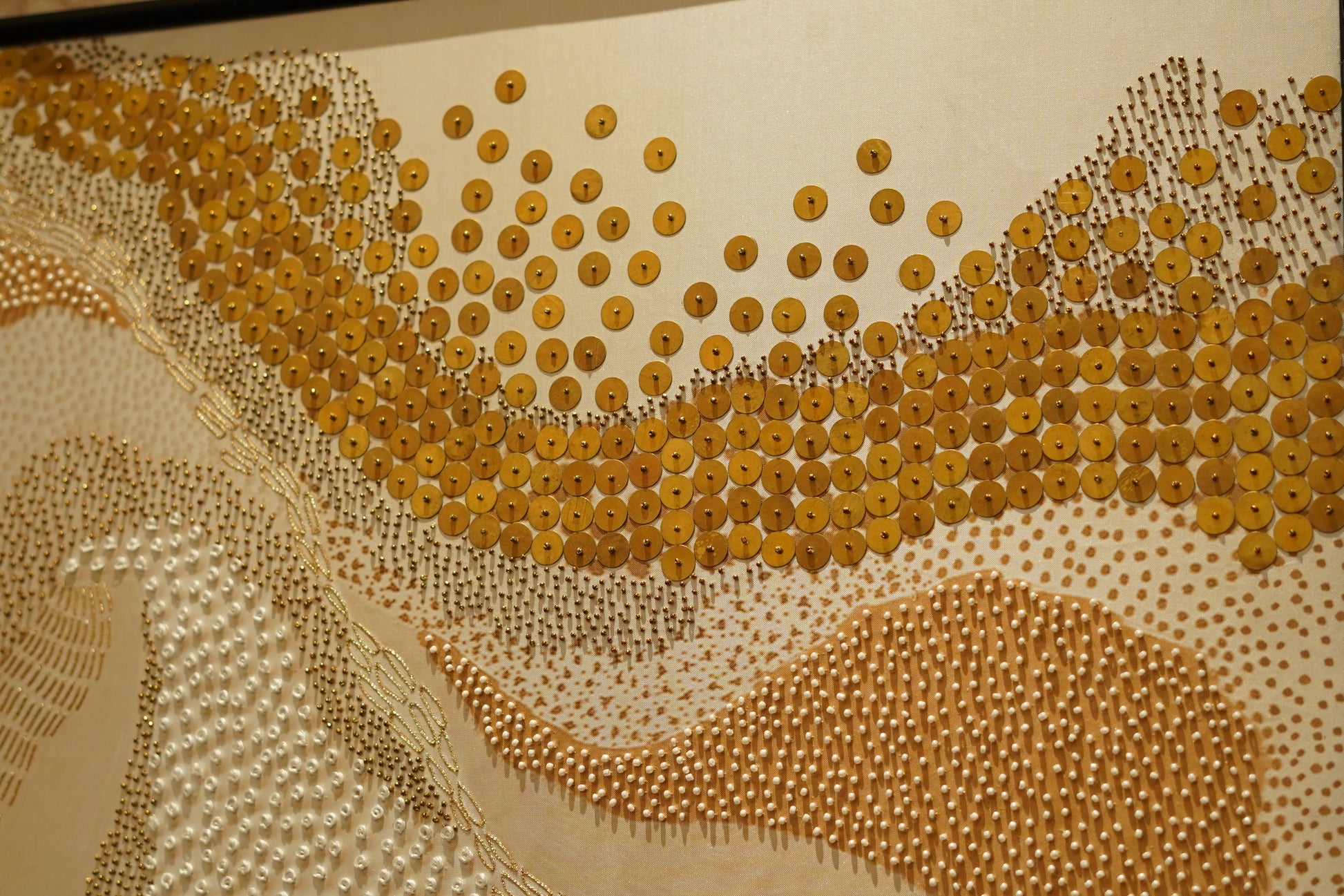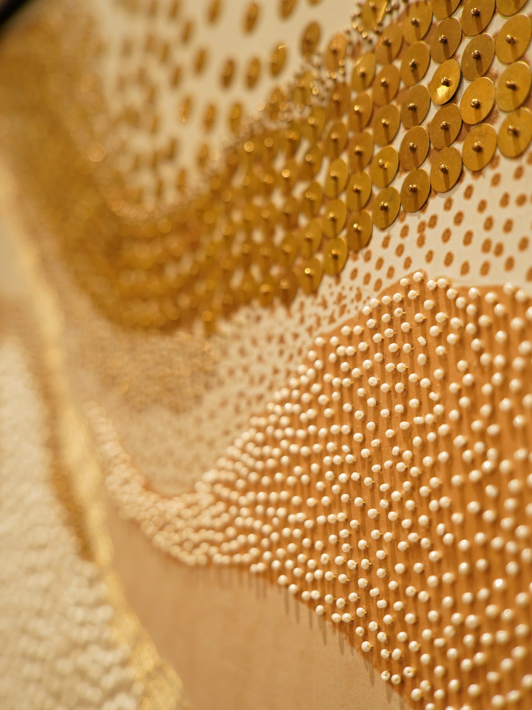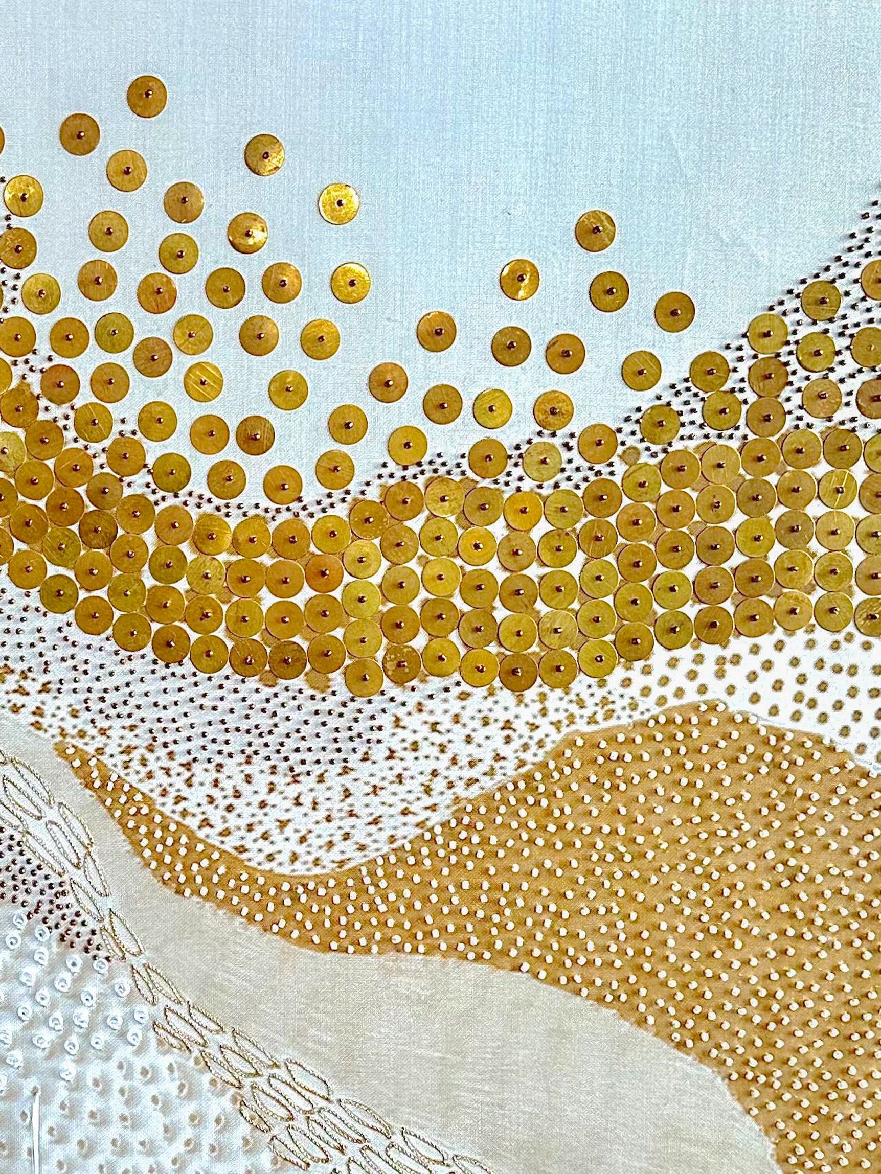 A radiant fusion of traditional craftsmanship and contemporary abstraction, SOLSTICE GLAZE captures the essence of shifting light on a luxurious Slub Silk base. This design utilizes a sophisticated Multi-Work technique, layering rich Silk Threads with the intricate textures of Zardosi Dori. The composition is brilliantly illuminated by a mix of Brass Sequins, Antique Beads, and White Glass Beads, creating a shimmering, high-relief surface. This handcrafted masterpiece offers a warm, luminous energy, transforming your walls into a gallery of tactile elegance.